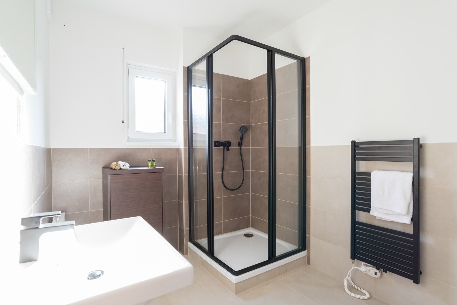 koupelna se sprchovým koutem, toaleta, předsíň, terasovitá zahrada a parkoviště.